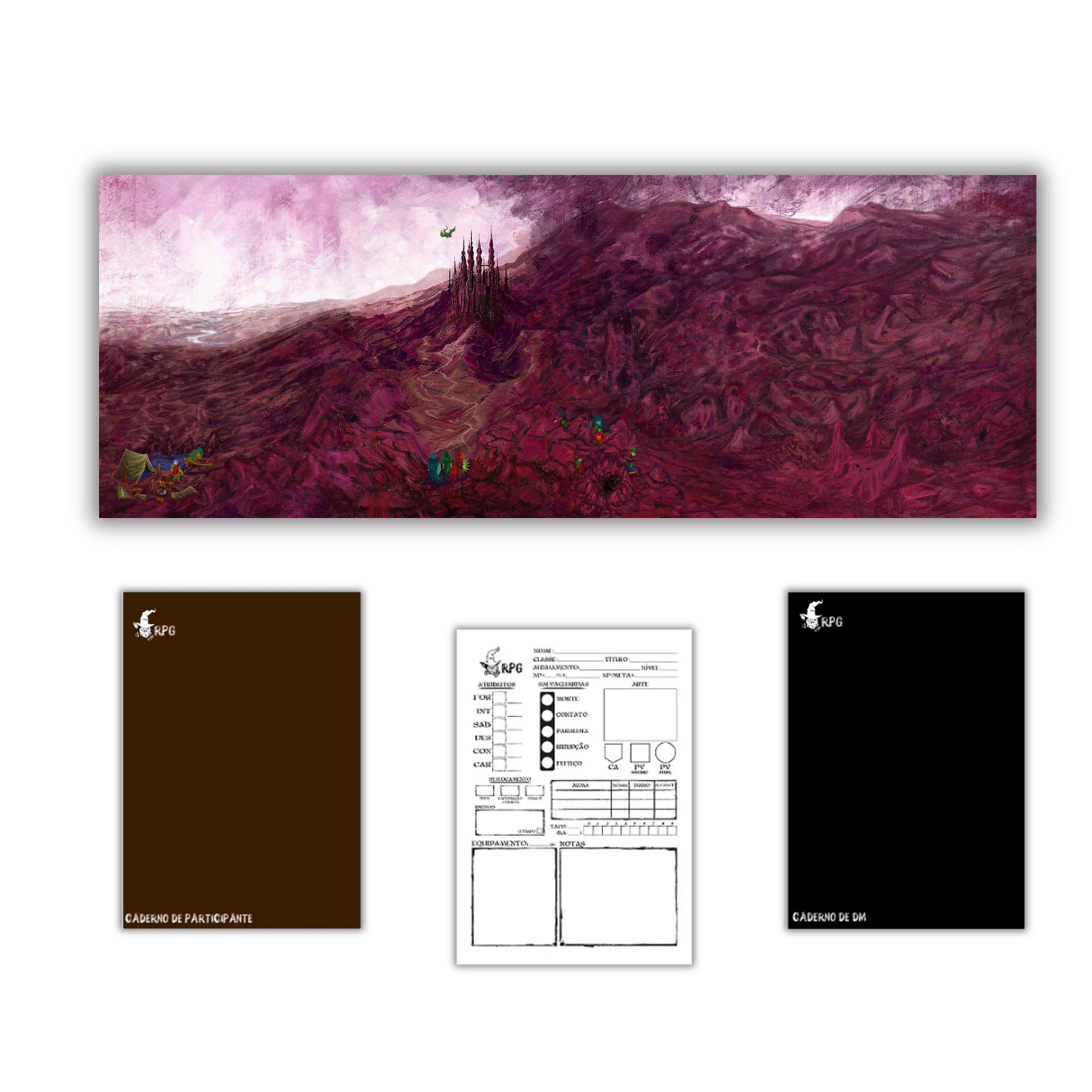 Escudo do Narrador, Bloco de Fichas, Caderdo de Participante e Caderno de DM.